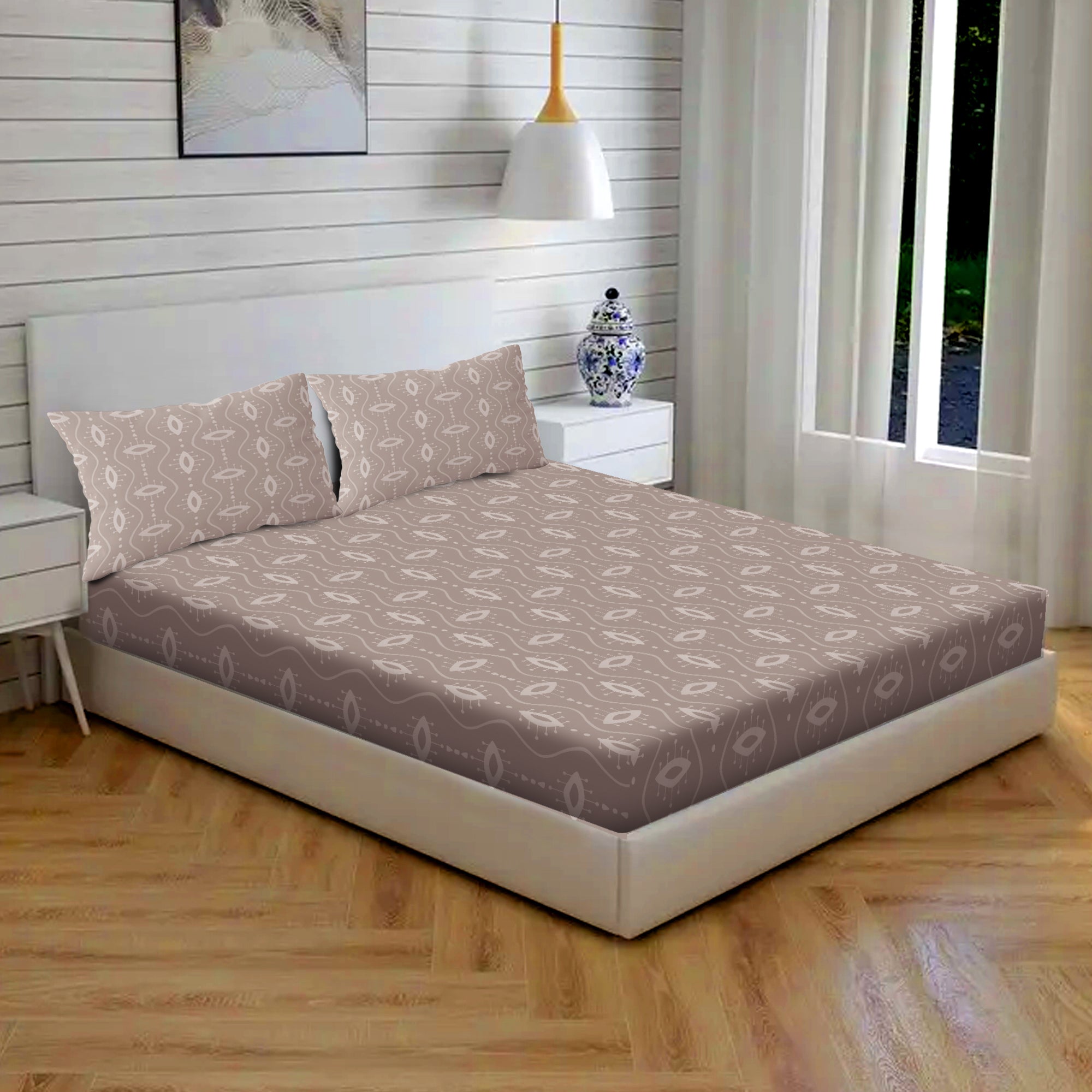 This bedsheet features a chic geometric pattern inspired by modern tribal motifs, with repeating shapes of delicate ovals and intricate accents set against a neutral taupe background. The wavy lines interweaving the design create a sense of fluidity and movement, giving the pattern a unique and dynamic look. Perfectly blending minimalism with contemporary aesthetics, this pattern is ideal for those looking to elevate their bedroom decor with understated elegance. Whether you're refreshing your space or looking for versatile designs, this printed bedsheet offers a stylish addition to any interior.
