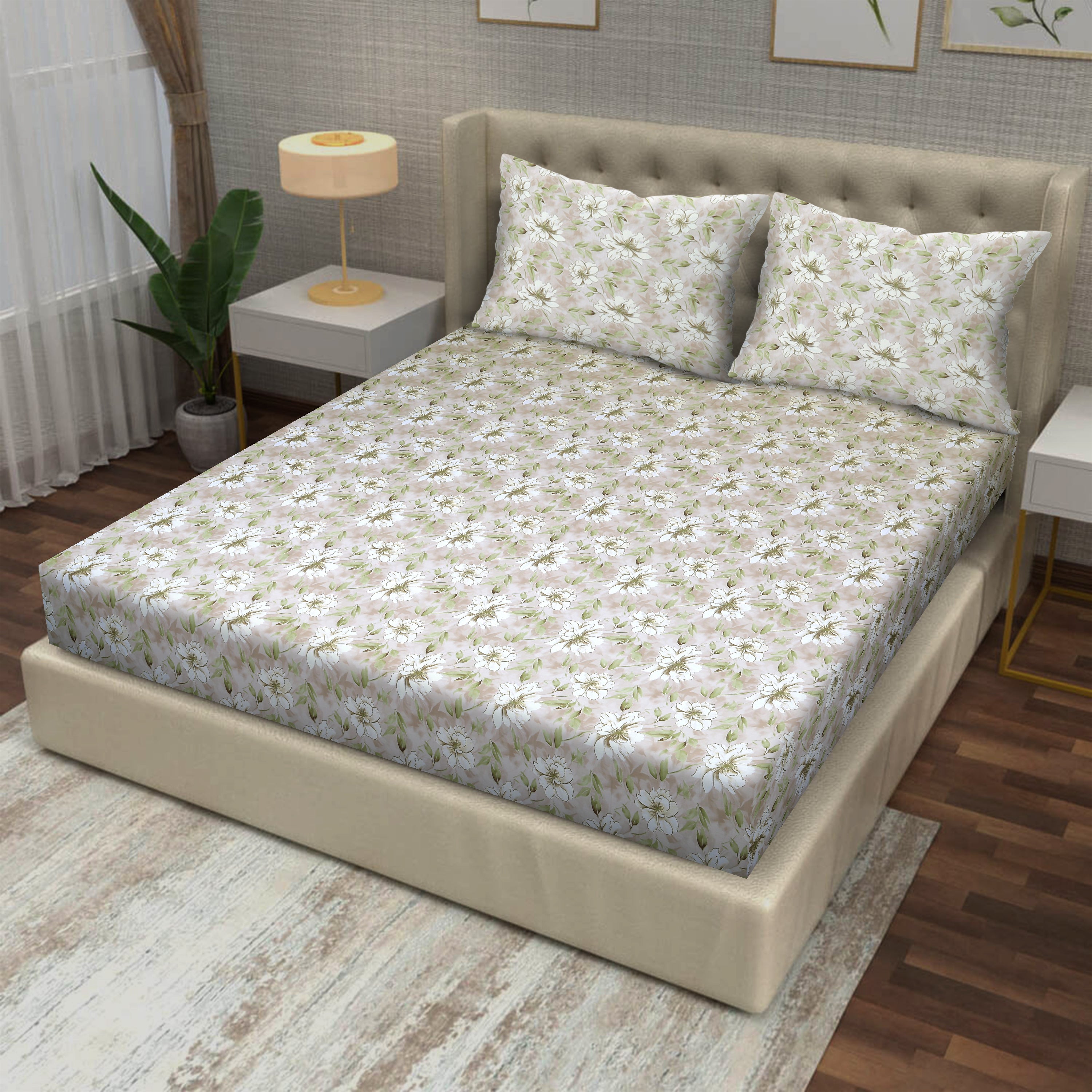 White flowers with soft green leaves on a neutral beige background, making it ideal for customers looking for a warm and earthy floral design. The subtle tones and elegant details are perfect for creating a minimalist yet sophisticated bedroom ambiance. Popular among those seeking calming, nature-inspired prints, this design complements a variety of interior styles and adds a touch of timeless charm to any space.